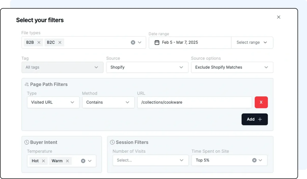 Filter identified website visitors based on intent signals and first-party data. Or, leverage our AI-generated audiences based on your historical customer data, identifying the very best hidden browsers. Push these audiences to Meta (Facebook), Klaviyo, TikTok and more to build high-performing lookalike and retargeting audiences.